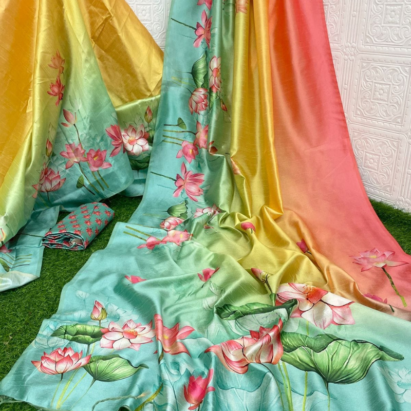 Grace your everyday routine and office hours with the refined charm of our lightweight, breathable & easy-flowing sarees, crafted to offer beauty, comfort, and versatility. These stunning sarees showcase a vibrant ombre blend across various color combinations, seamlessly fused with digitally printed lotus blooms – a symbol of grace and resilience.