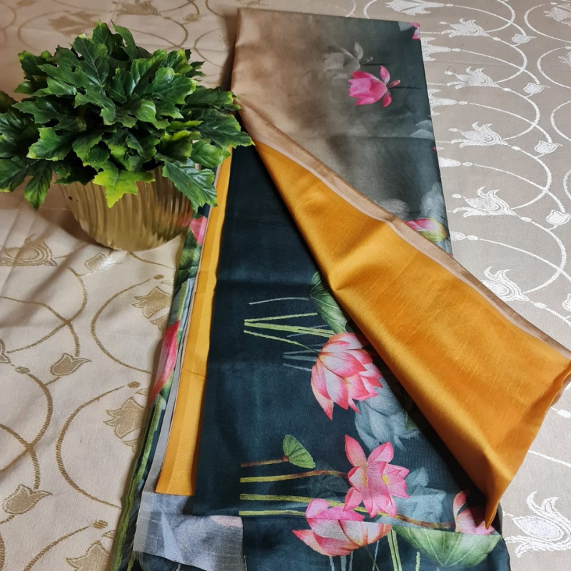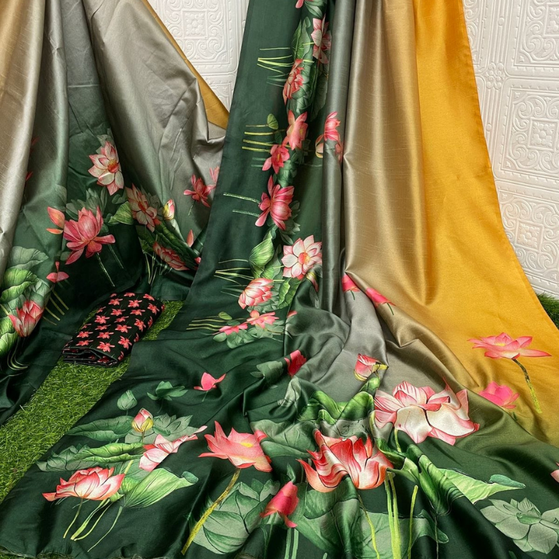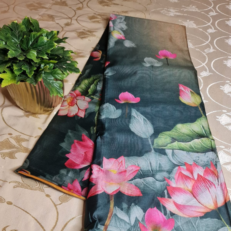 Grace your everyday routine and office hours with the refined charm of our lightweight, breathable & easy-flowing sarees, crafted to offer beauty, comfort, and versatility. These stunning sarees showcase a vibrant ombre blend across various color combinations, seamlessly fused with digitally printed lotus blooms – a symbol of grace and resilience.