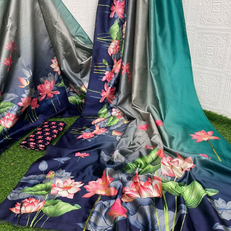 Grace your everyday routine and office hours with the refined charm of our lightweight, breathable & easy-flowing sarees, crafted to offer beauty, comfort, and versatility. These stunning sarees showcase a vibrant ombre blend across various color combinations, seamlessly fused with digitally printed lotus blooms – a symbol of grace and resilience.