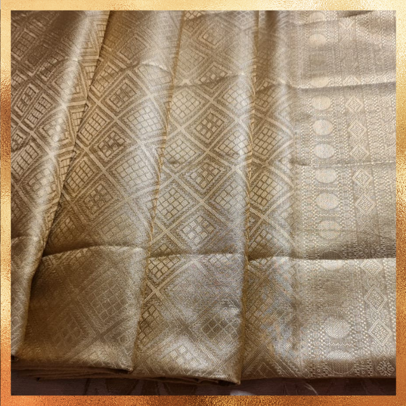 What truly sets this piece apart is the rich brocade intricate body with rich butta work —highlighted with delicate small box motifs—adding a touch of artistic heritage to your drape. Paired with a matching blouse in gold zari brocade, this saree promises to turn heads and steal hearts.