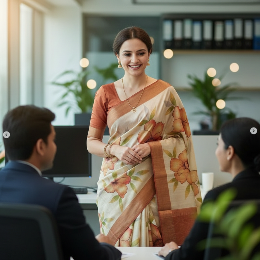 A celebration of earthy elegance and delicate craftsmanship, this hand-painted Kosa Silk saree is a timeless drape for the modern woman who cherishes tradition.