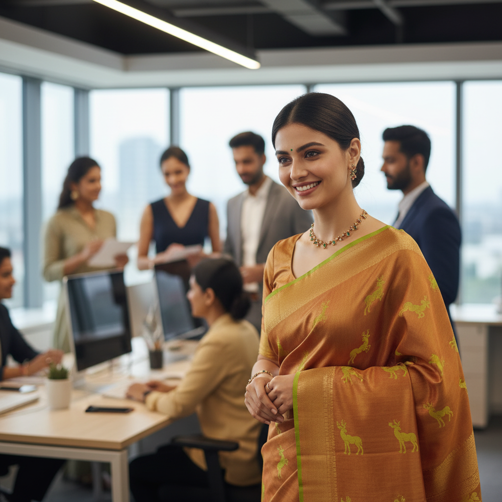 Woven from lightweight, breathable silk mix blends, these sarees are ideal for all-day wear – from boardroom meetings to casual gatherings. The soft texture ensures ease of movement, while the flowy drape flatters your silhouette. The eye-catching floral print adds a touch of artistry without being overpowering, making it a perfect balance of professional elegance and artistic expression.
