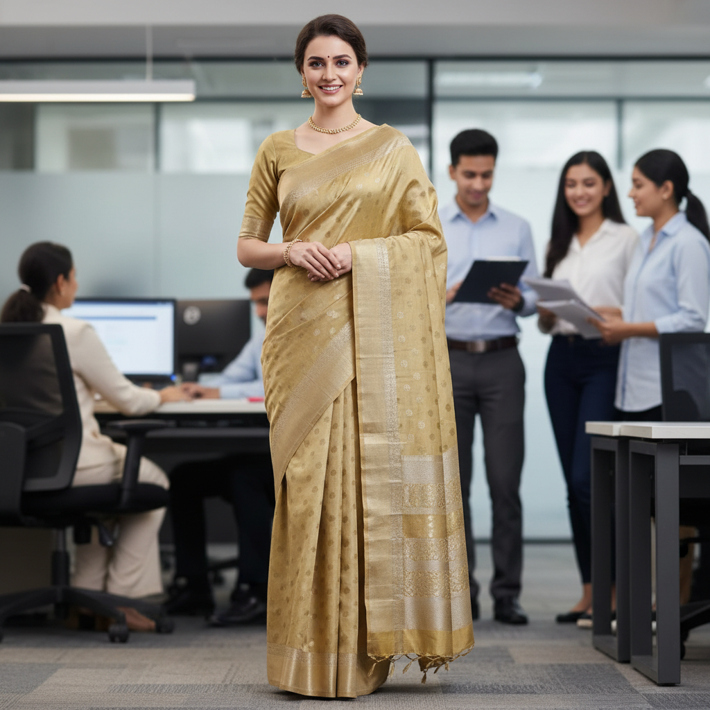 Woven from natural silk threads, Tussar Silk sarees have a unique texture and a naturally golden sheen that sets them apart. Lightweight yet rich, this saree flows effortlessly—making it an ideal choice for day functions, intimate weddings, cultural events, or even elegant workwear.